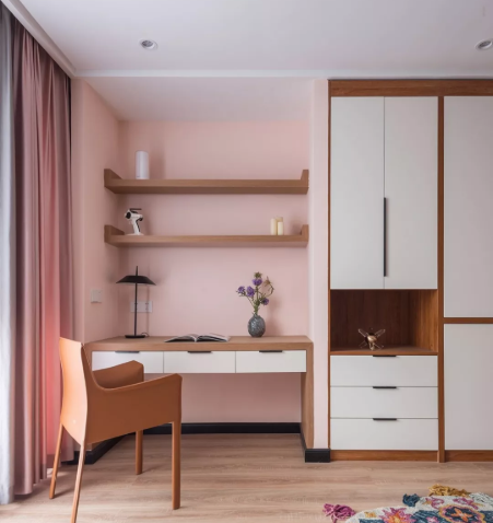 床尾设计大面积储物柜,并延伸出写字台与置物层板,儿童房颜值与功能兼具。