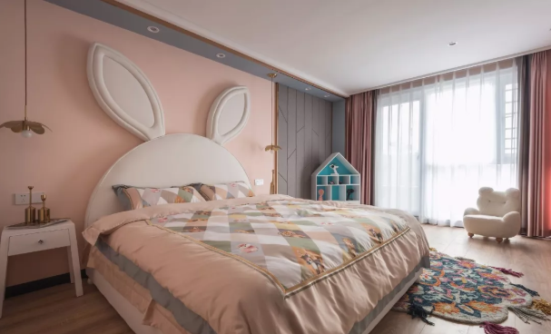灰粉色主调与兔耳创意大床,让儿童房变得更有童趣,床头点缀金色花朵吊灯更是锦上添花。