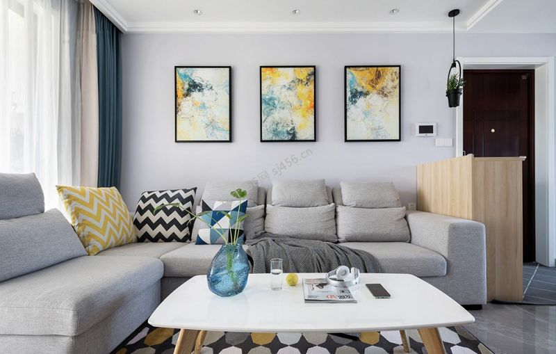 110平现代简约三居室客厅沙发墙装修图片